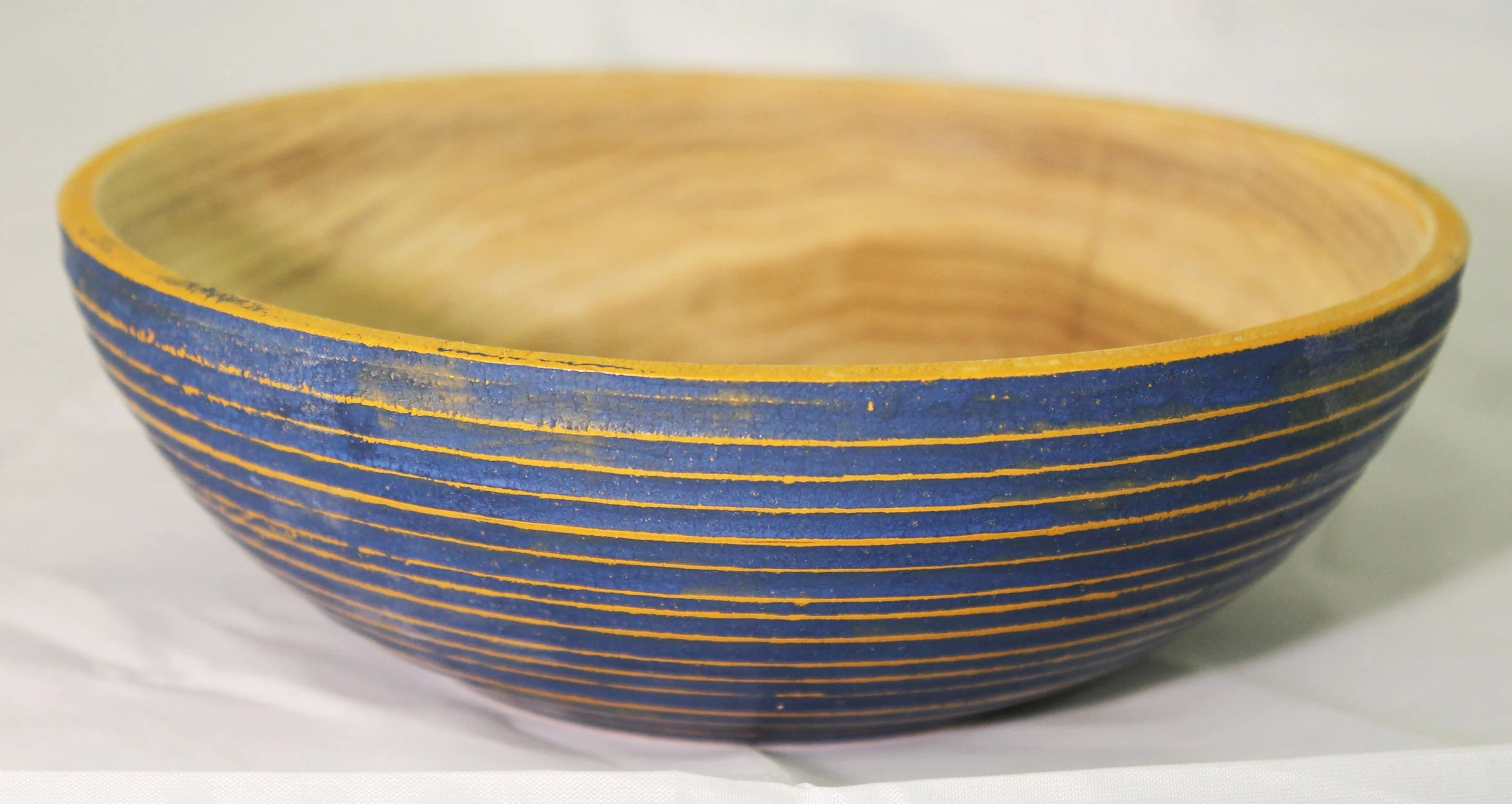 6263 - Poplar Milk Paint Round Bowl The outside wall of this bowl has coats of yellow and blue milk paint. The wall is then sanded to get that 2 color appearance